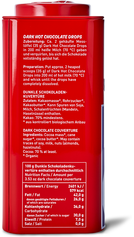 2 gehäufte Messlöffel (35 g) Dark Hot Chocolate Drops in 150 ml heiße Milch (70°C) geben und verquirlen, bis sich der Kakao vollständig gelöst hat.BARCODE EINZEL