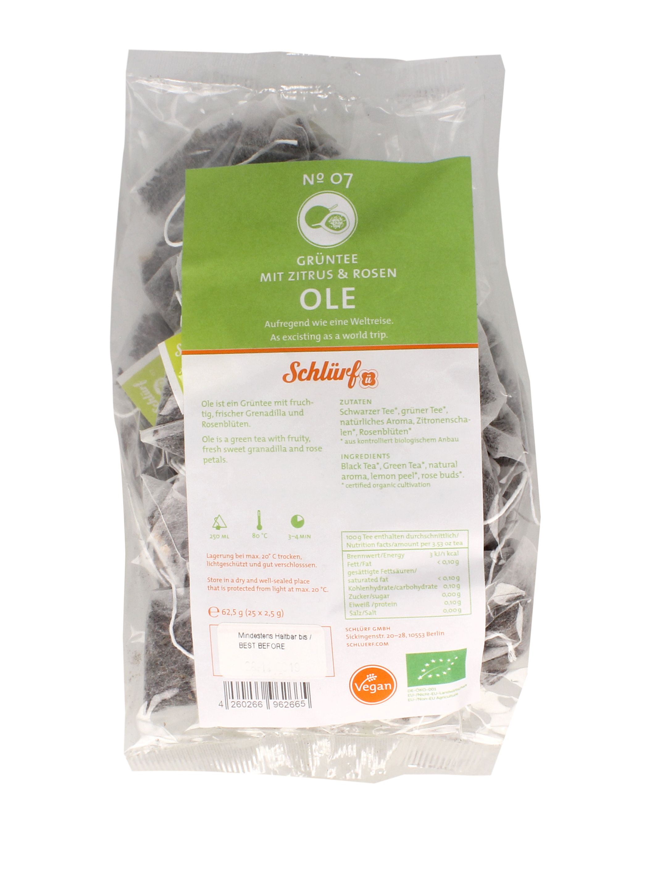 Ole ist ein Schwarz-/Grünteemischung mit fruchtig, frischer Grenadilla und Rosenblüten.